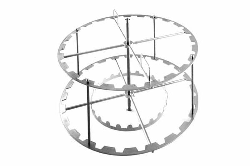 - El tambor radial puede transformarse fácilmente en tambor tangencial añadiendo cuatro rejillas de colgado para funcionamiento tangencial (Art. Nº 7761). Así se pueden centrifugar cuatro cuadros grandes de hasta 30 cm de altura. En ese caso puede utilizarse una bolsa colectora para la cera de descapsulado (Art. Nº 7758) para que la miel fluya fácilmente desde los opérculos.