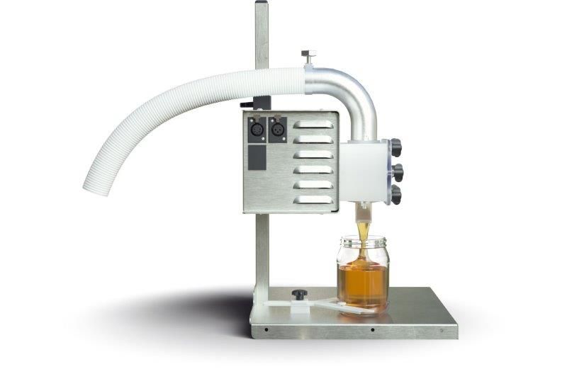 La miel se succiona desde un depósito de cualquier volumen mediante la manguera suministrada y una válvula antirretorno, y se dosifica sin goteo directamente en el tarro. Se incluyen diferentes boquillas de llenado que se seleccionan según el diámetro del tarro y la viscosidad de la miel.