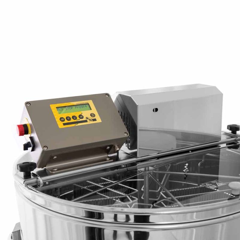 Centrífuga autoinvertible para 6 marcos con motor 180 W / 230 V y control totalmente automático. Incorpora un interruptor de seguridad que apaga el motor automáticamente al abrir la tapa. La tecnología más avanzada nos ha permitido desarrollar un fondo de depósito innovador. El fondo del depósito está soldado sin juntas y con inclinación hacia la salida. La centrífuga dispone de dos grifos de salida inox (6/4''), uno ubicado en el punto más bajo posible para permitir que toda la miel fluya fuera del depósito. Todas las piezas que entran en contacto con la miel están fabricadas con materiales aptos para uso alimentario. La tapa es de acrílico transparente.