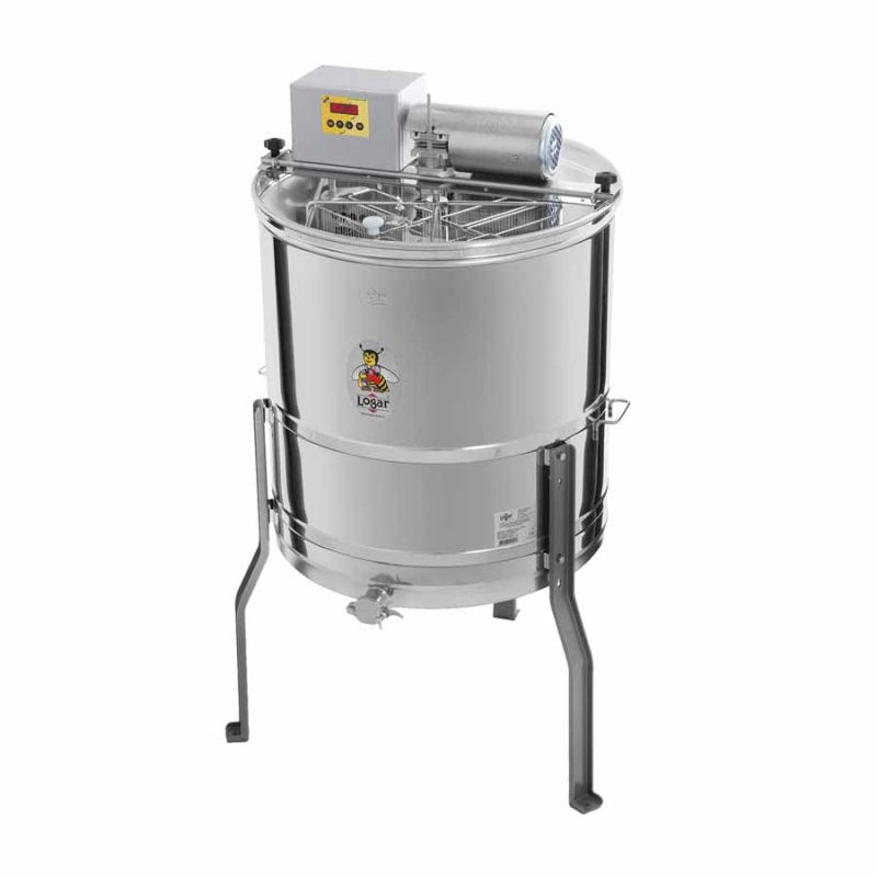Centrífuga con volteo automático e doble compartimento innovadora, diseñada para centrifugar de forma eficiente muchas alzas bajas en un tambor de pequeño diámetro. La centrífuga de 8 cuadros con volteo automático y motor (110 W / 230 V) dispone de control totalmente automático y de un interruptor de seguridad que corta el motor inmediatamente al abrir la tapa. Los compartimentos dobles para los cuadros están separados por una placa por la que discurre la miel. Tecnología de última generación y un fondo del tambor soldado sin juntas e inclinado hacia el grifo permiten un vaciado completo de la miel. El grifo exprimidor inoxidable está soldado en el punto más bajo para que se pueda extraer toda la miel. Todas las piezas en contacto con la miel están fabricadas con materiales aptos para uso alimentario. La tapa es de metacrilato transparente y los pies especialmente diseñados garantizan una gran estabilidad.