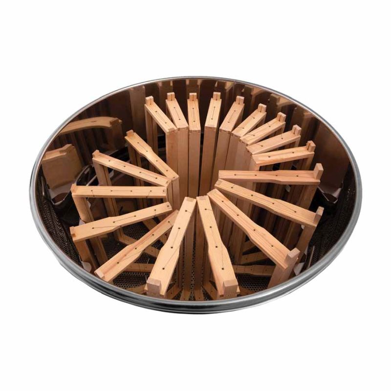 Indicado para: Paneles enteros (sin cortar) – ideal para fundir la cera de opérculo, miel con melezitosa y miel cristalizada. Capacidad: aprox. 40 kg de cera de opérculo; espacio para aprox. 14 Zander / 14 DNM / 28 Dadant-blatt / aprox. 12 Langstroth (1/1) o 18 AZ. Dimensiones interiores máximas: diámetro interior del recipiente 63 cm, altura interior 51 cm.