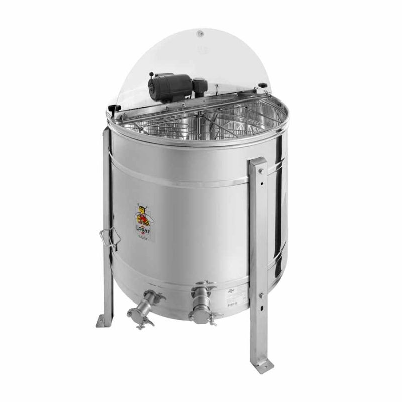 Extractor auto-inversor de 4 cuadros con motor 110 W / 230 V y conmutador de seguridad que apaga automáticamente el motor al abrir la tapa. Mediante la palanca de regulación se puede ajustar la velocidad deseada entre 0 y 280 revoluciones por minuto y seleccionar giro a la izquierda o a la derecha. La tecnología más avanzada nos ha permitido desarrollar de forma innovadora el fondo de la cuba. El fondo de la cuba está soldado sin costuras y con inclinación hacia el desagüe. El grifo exprimidor inoxidable 6/4" está instalado en el punto más bajo posible para que toda la miel pueda salir del extractor. Todas las piezas del extractor que entran en contacto con la miel están realizadas en materiales aptos para uso alimentario. La tapa es de metacrilato transparente.