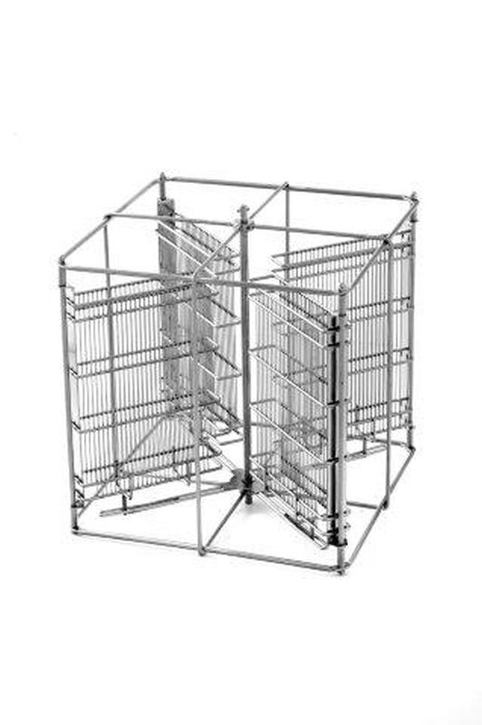 Los compartimentos portamarcos se fabrican con varillas verticales de densidad adecuada para que los marcos no se dañen durante el centrifugado. Están conectados entre sí mediante un mecanismo especial. Los compartimentos evitan que la miel se acumule en ellos durante el centrifugado, por eso los marcos quedan secos tras el proceso.