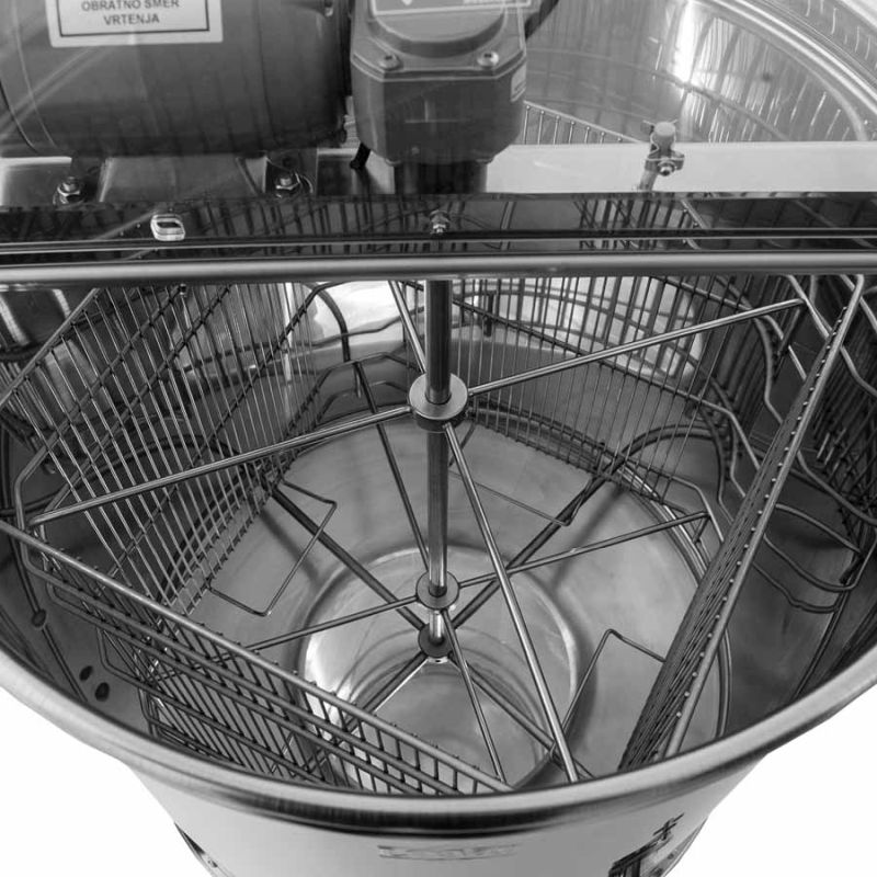 Este extractor tangencial de 4 cuadros dispone de accionamiento por motor (110 W/230 V) con interruptor de seguridad integrado que apaga automáticamente el motor al abrir la tapa. El extractor está diseñado sin fondo y se coloca directamente sobre una jarra coladora, fijándose con un anillo de sujeción ajustable — de este modo se evita vuelcos y se incrementa la estabilidad durante el centrifugado. La miel extraída fluye directamente a la jarra coladora situada debajo.